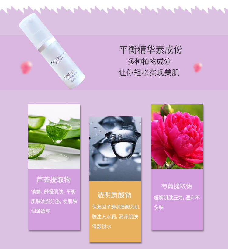 多种植物天然成分臻至融合,抑制粉刺/油脂/痘痘,增加皮肤抵抗力,能够维护受损皮肤,调整皮肤油水平衡,绽放自然健康,莹润透亮肌肤