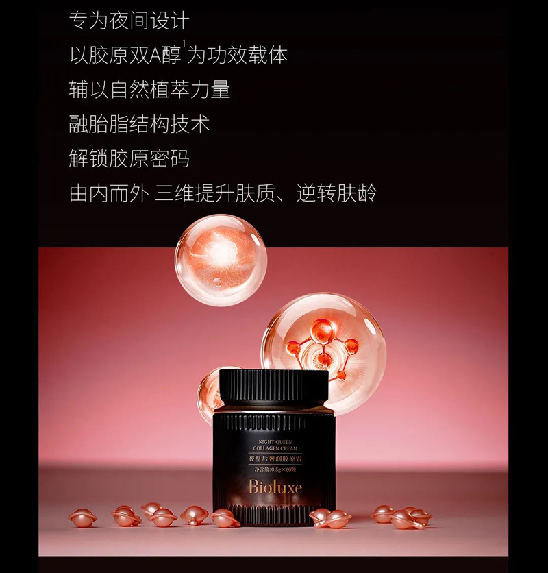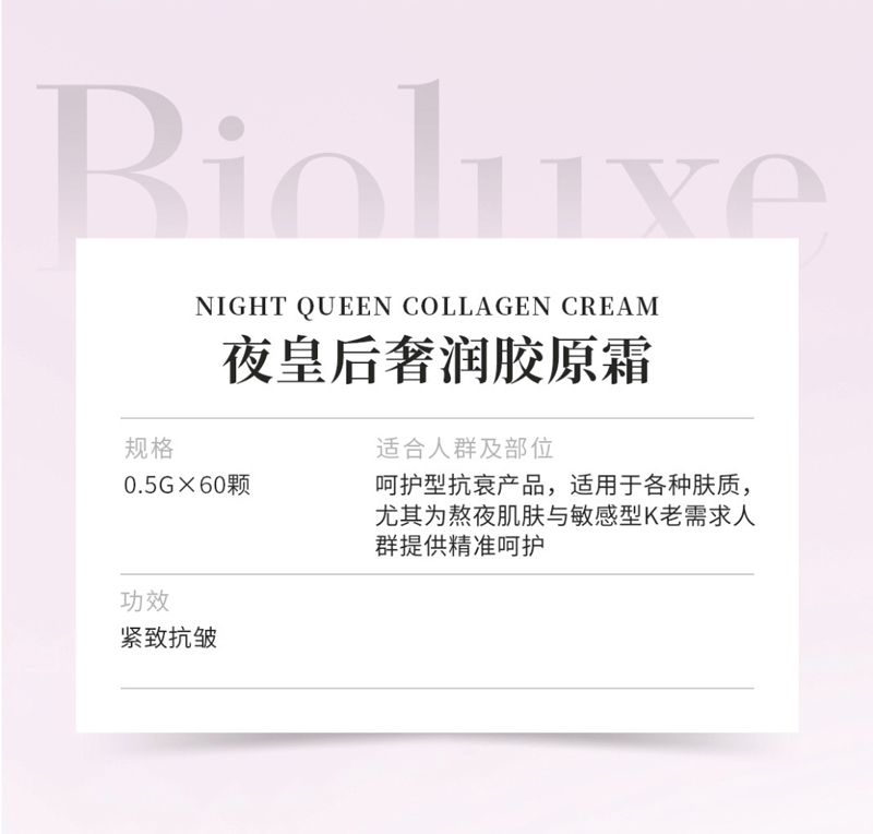 • 商品名称:BIOLUXE夜皇后奢润胶原霜0.5g*60颗 加护屏障/厚脸皮、深补胶原/不跨脸、丝滑柔润/不卡粉