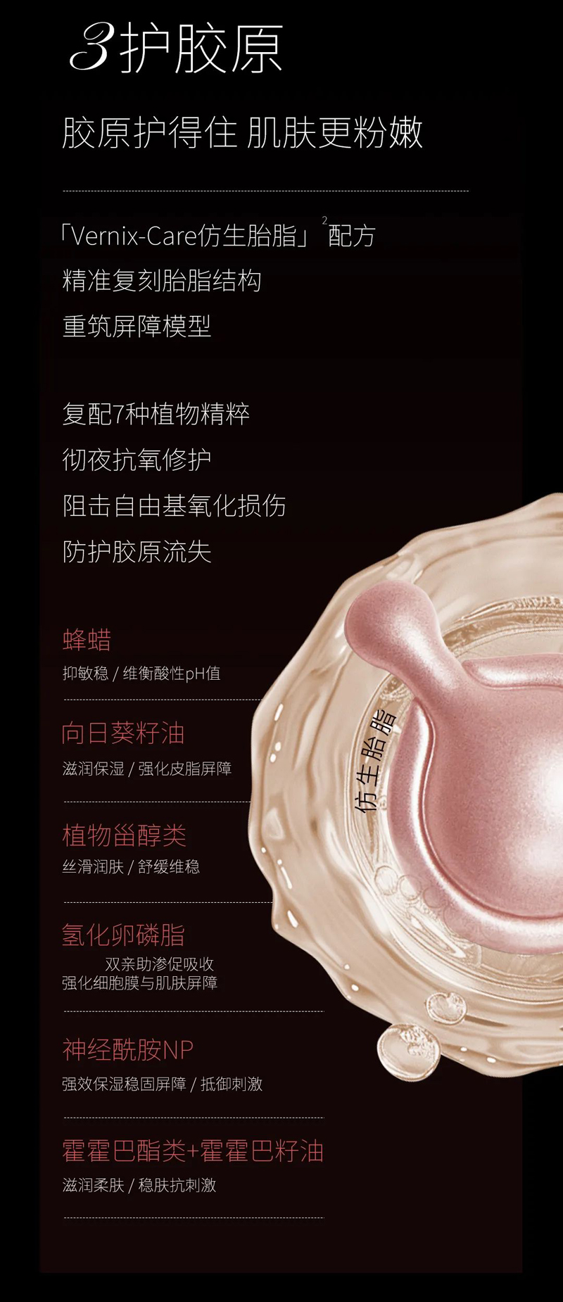 适合肌肤:呵护型抗老化产品,适用于各种肤质,尤其为熬夜肌肤与敏弱型抗老化需求人群提供精准呵护