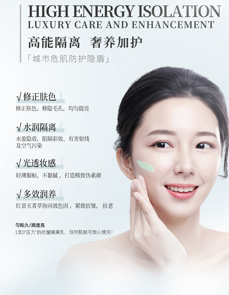 蕴含红景天、玻色因等成分,防晒、隔离、遮瑕、保湿、紧致多效合一,帮助隔离彩妆、灰尘,同时提亮肤色,触感柔滑,带给肌肤明亮的自然妆感
