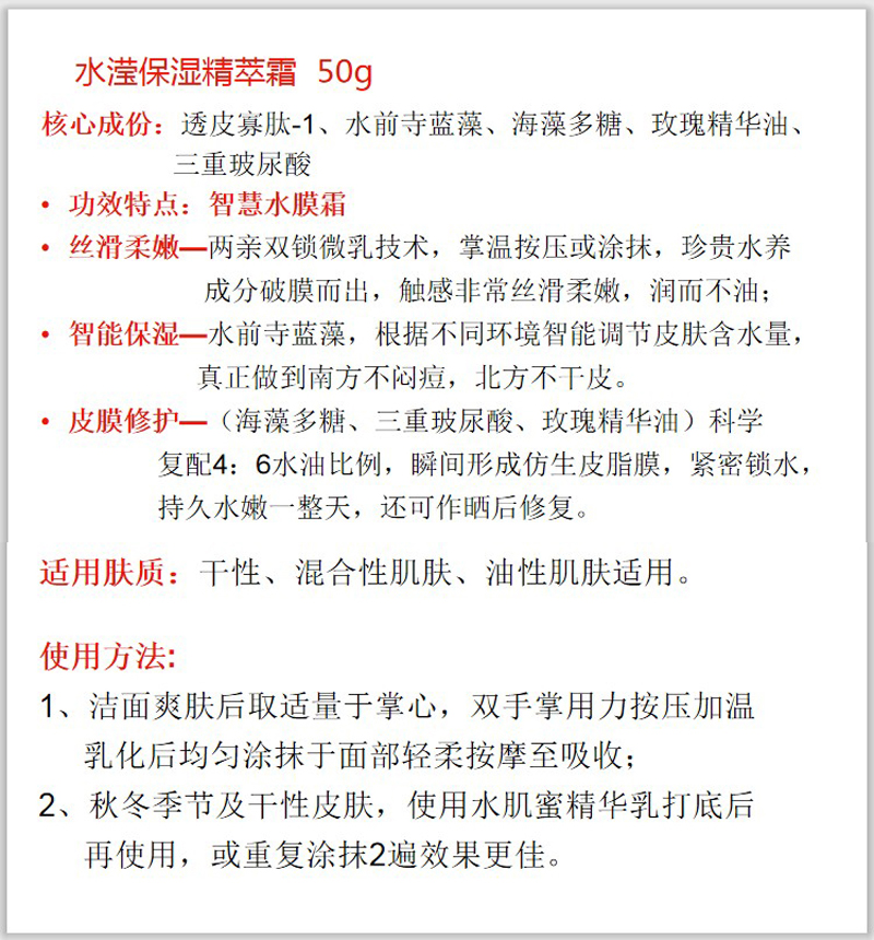 1.丝滑柔嫩——两亲双锁微乳技术,掌温按压或涂抹,珍贵水养成分破膜而出,触感非常丝滑柔嫩,润而不油;
