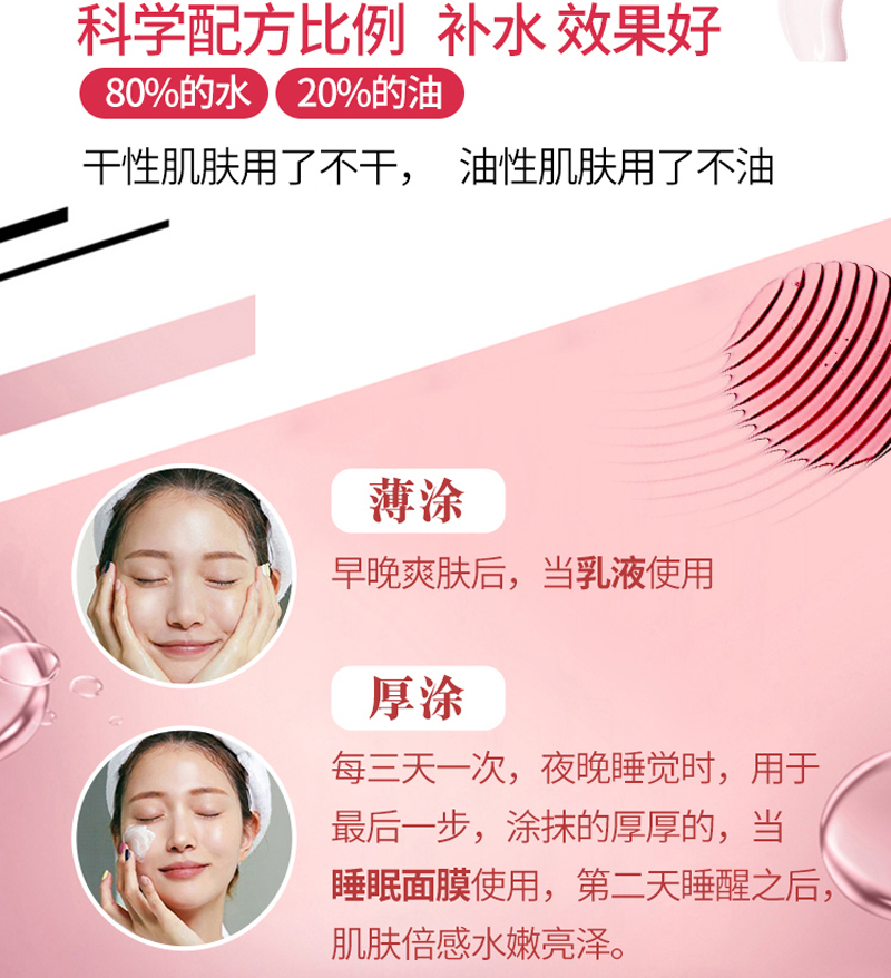 以“肽”为主要成份,改善皮肤干燥、粗糙、起皮、紧绷、干燥、真正的水润不粘腻