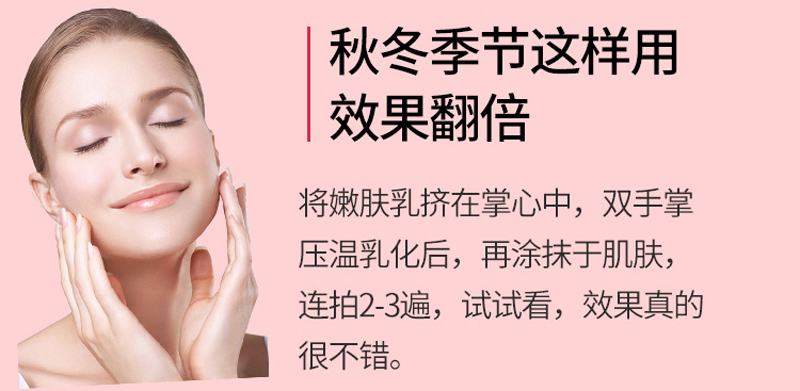 3.秋冬季节及干性皮肤掌压温乳化,涂抹2-3遍作面部按摩5分钟,进行急救“乳疗”。