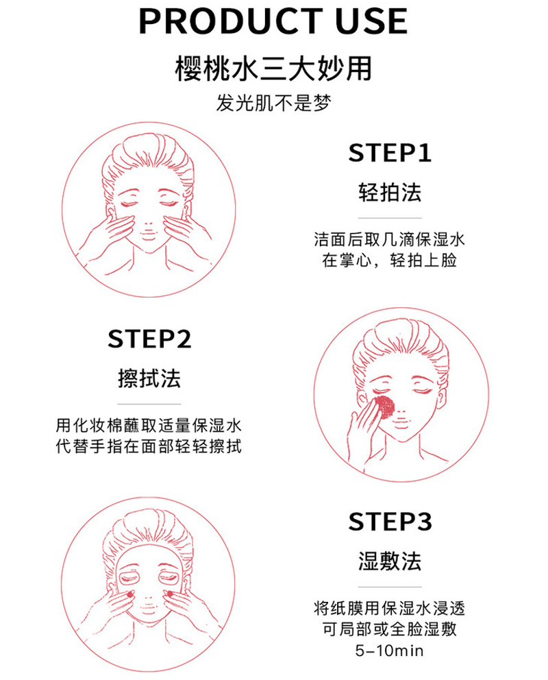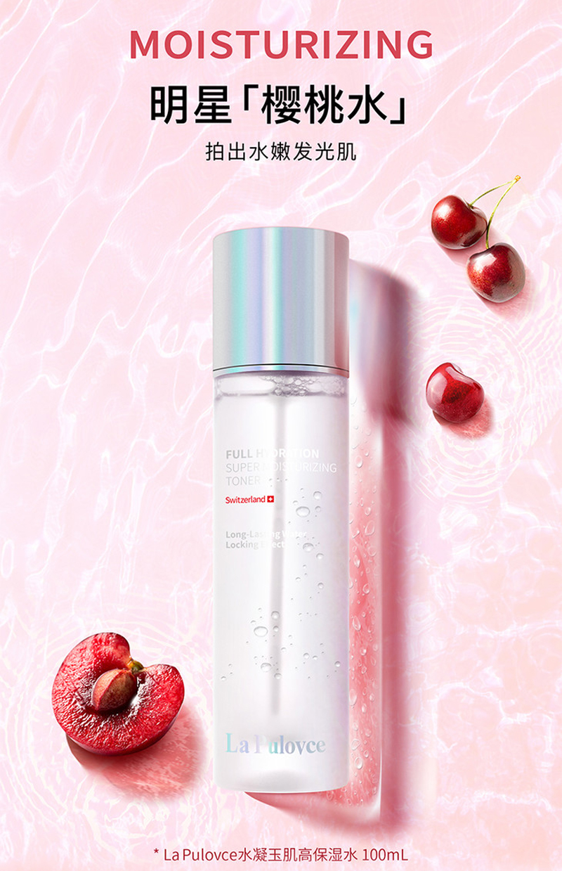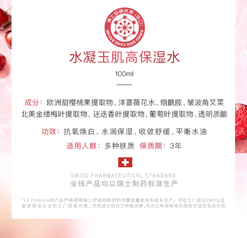 • 商品名称:拉普瑞斯 水凝玉肌高保湿水100ml(樱桃水)抗氧焕白、改善暗沉、均匀肤色、水润保湿、收敛舒缓、平衡水油